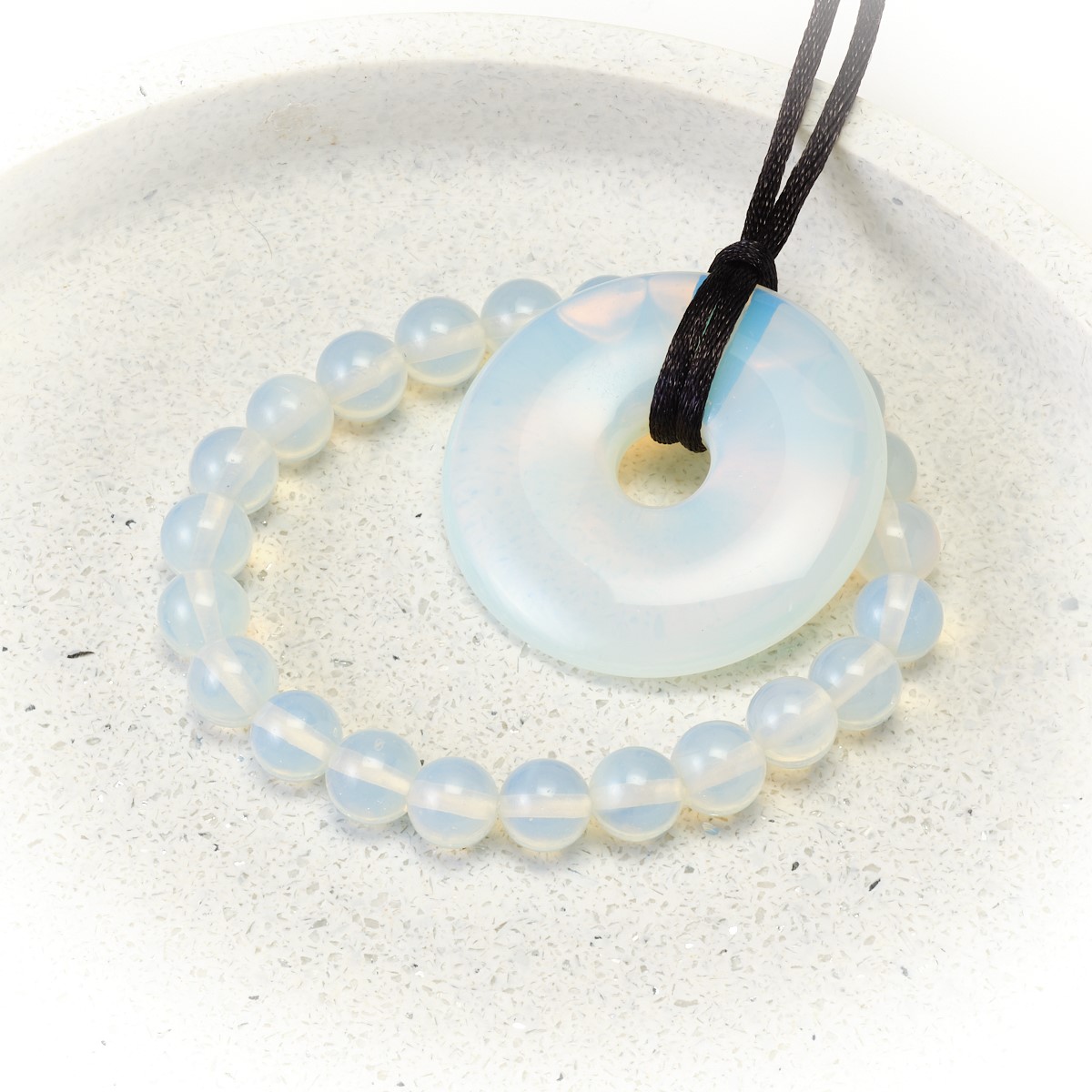 Opalite is said to stabilize mood swings and help to overcome tiredness. Emotionally, Opalite helps by assisting during transitions of all kinds. It encourages persistence and gives us strength in verbalizing our hidden feelings. It is a business stone and fosters success in all endeavors.
